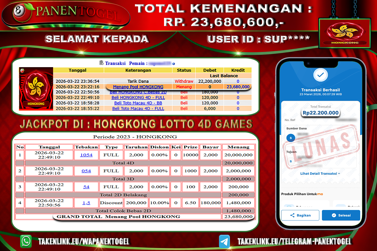 BUKTI KEMENANGAN TOGEL HONGKONG LOTTO 4D GAMES PANENTOGEL Rp. 23.680.600, - LUNAS