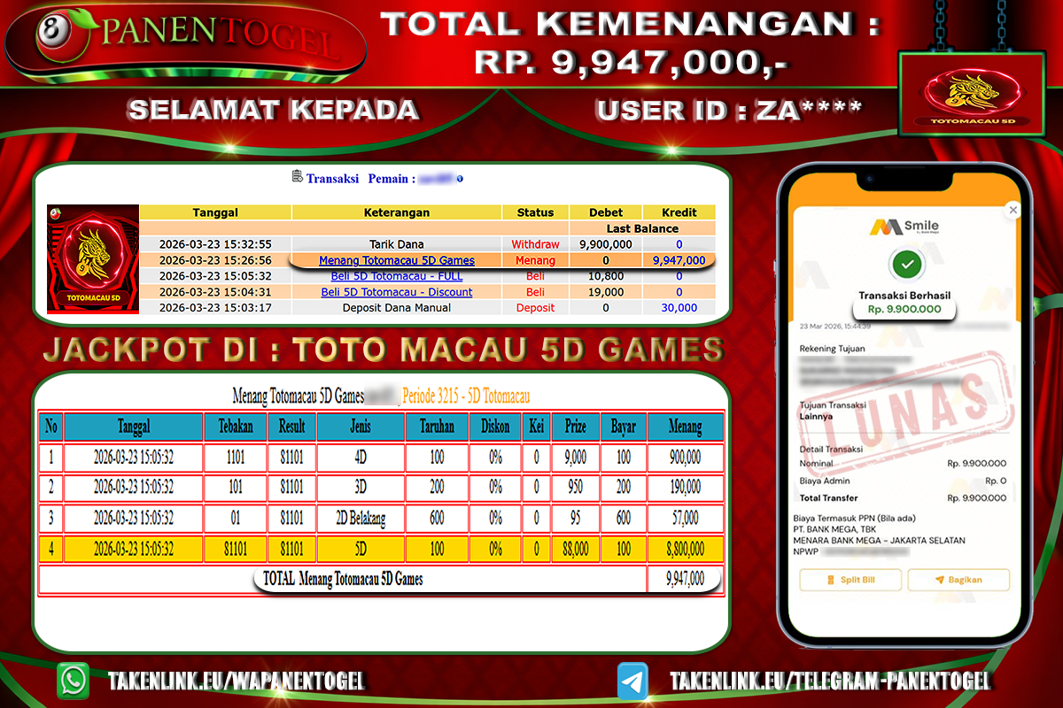 Selamat Kepada User ID : ZA**** Member PANENTOGEL JACKPOT TOGEL TOTO MACAU 5D GAMES PANENTOGEL