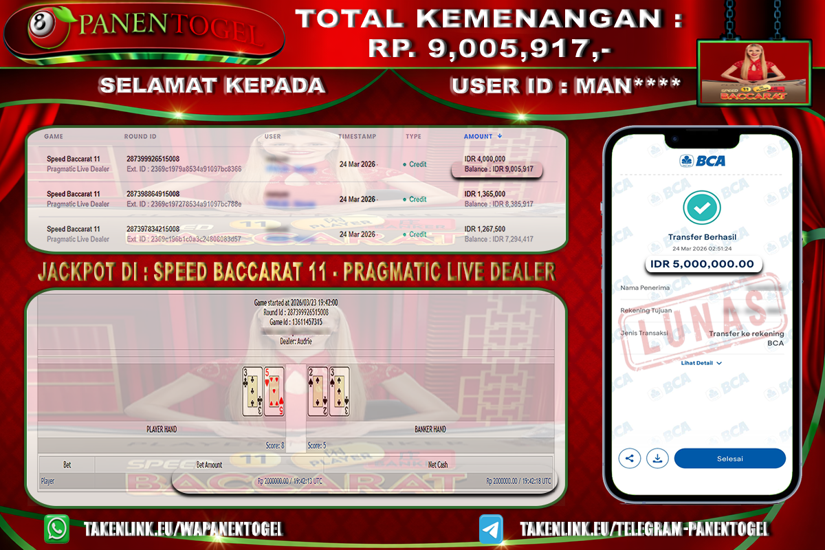Selamat Kepada User ID : MAN**** Member PANENTOGEL JACKPOT SPEED BACCARAT 11 PRAGMATIC LIVE CASINO