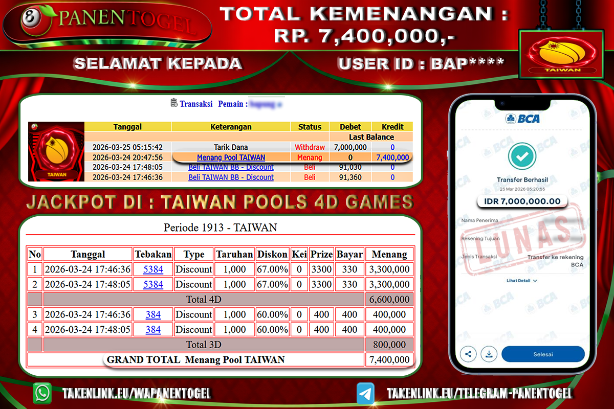 Selamat Kepada User ID : BAP**** Member PANENTOGEL JACKPOT TOGEL TAIWAN POOLS 4D
