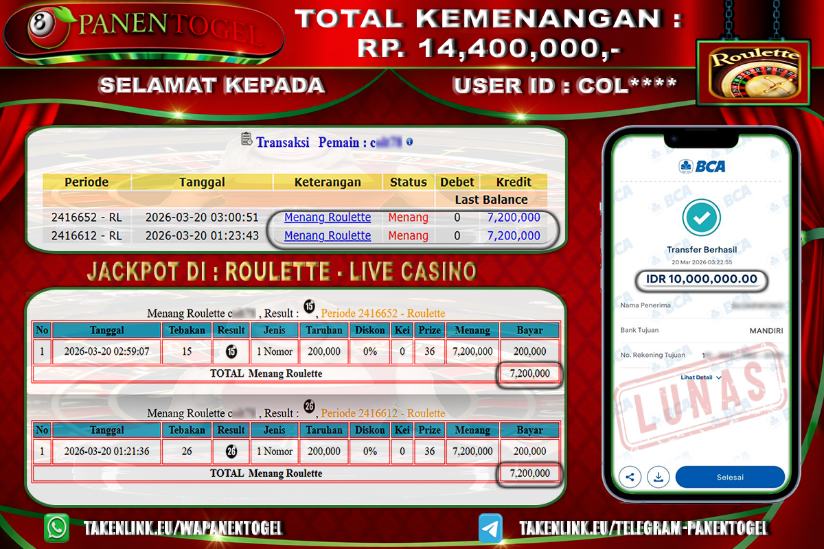 BUKTI KEMENANGAN LIVE GAME ROULETTE PANENTOGEL Rp. 14.400.000, - LUNAS