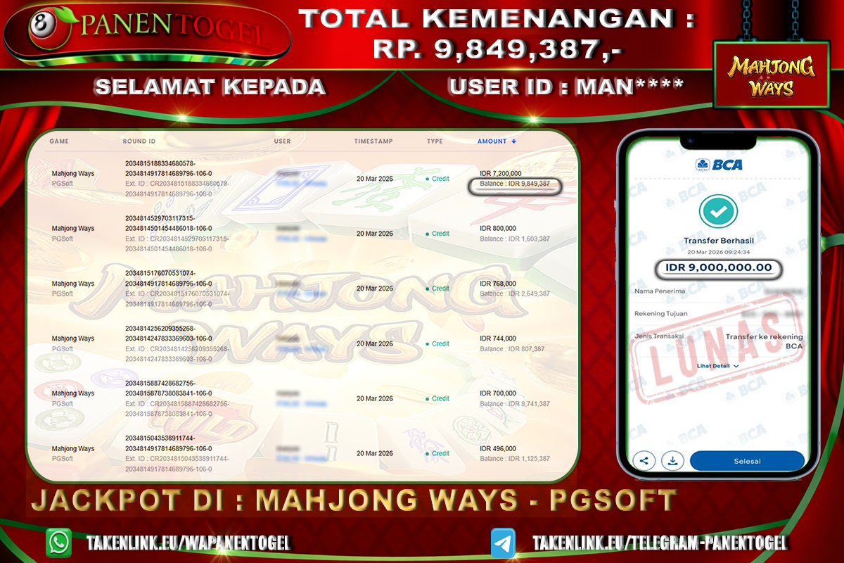 Selamat Kepada User ID : MAN**** Member PANENTOGEL JACKPOT MAHJONG WAYS