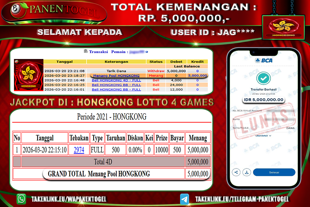BUKTI KEMENANGAN TOGEL HONGKONG LOTTO 4D GAMES PANENTOGEL Rp. 5.000.000, - LUNAS