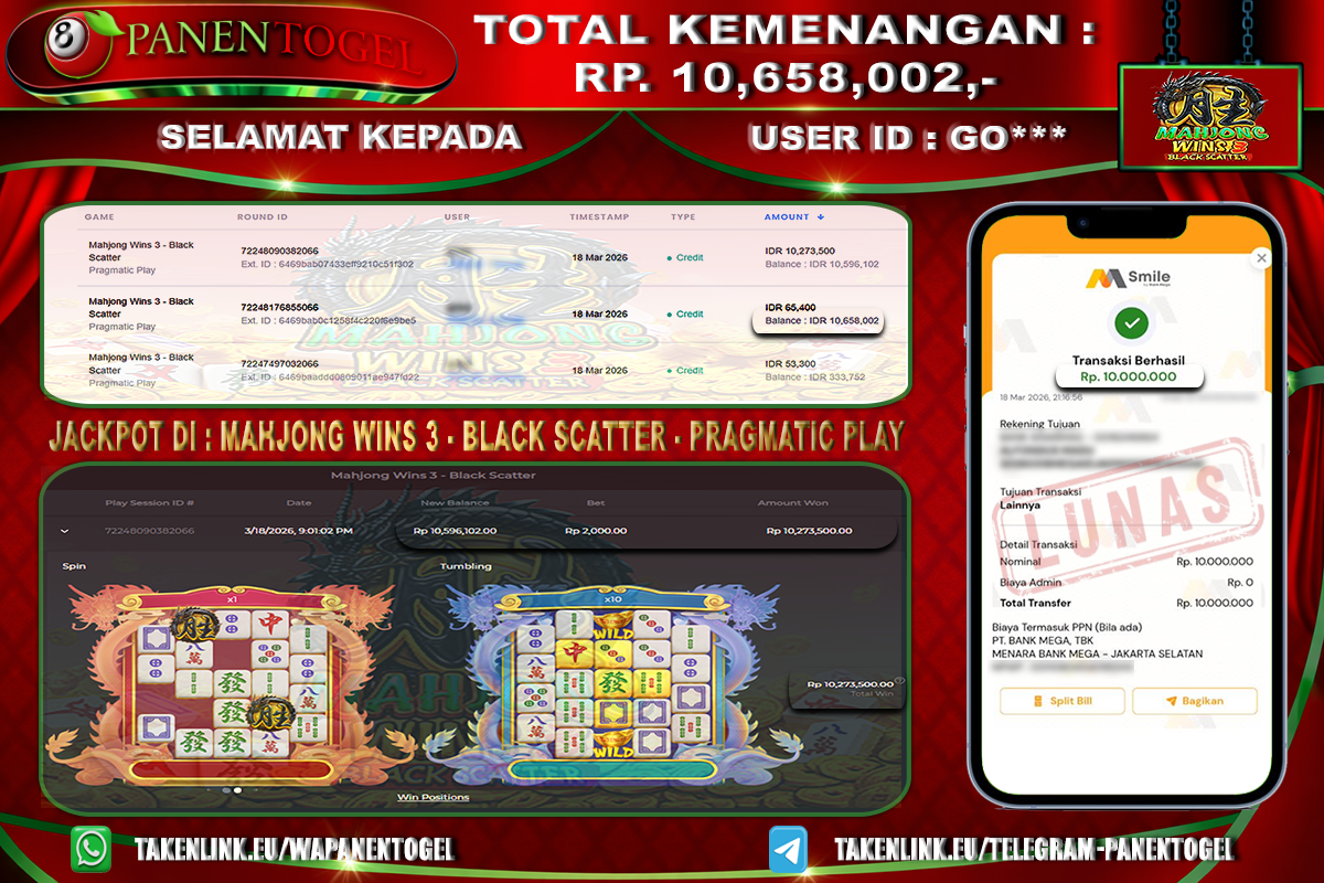Selamat Kepada User ID : GO**** Member PANENTOGEL JACKPOT MAHJONG WINS 3 BLACK SCATTER