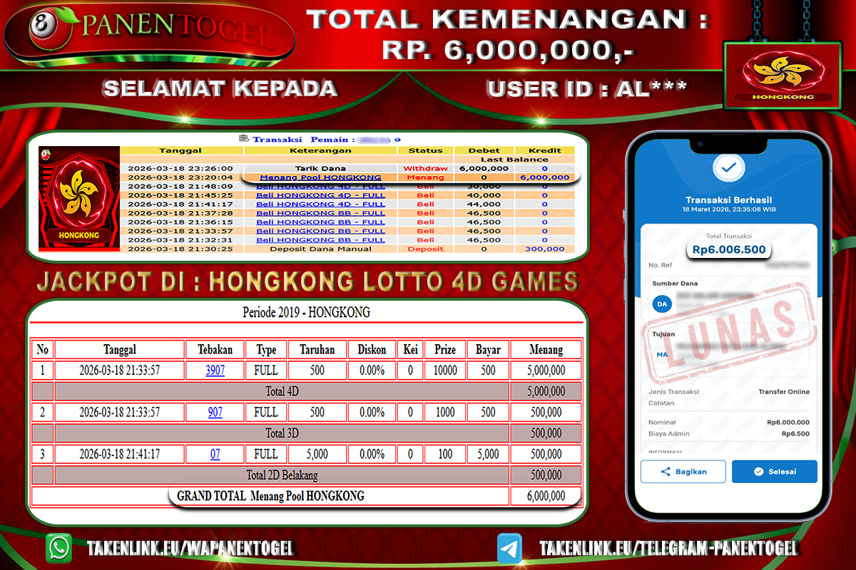 BUKTI KEMENANGAN TOGEL HONGKONG LOTTO 4D GAMES PANENTOGEL Rp. 6.000.000, - LUNAS