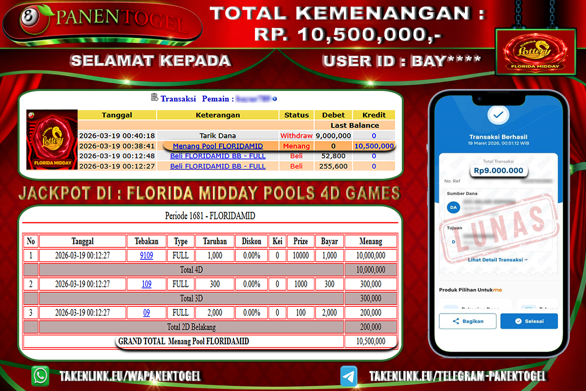 BUKTI KEMENANGAN FLORIDA MIDDAY POOLS 4D GAMES PANENTOGEL Rp. 10.500.000, - LUNAS