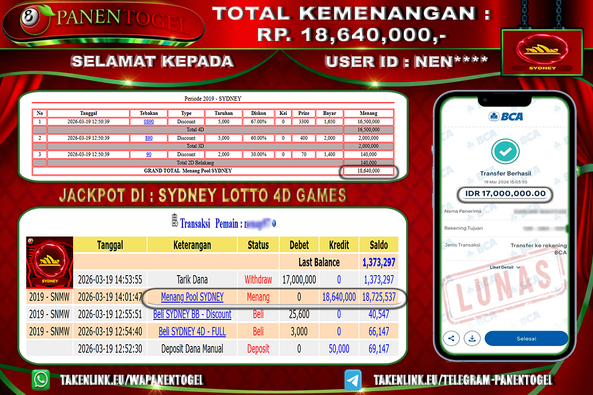 BUKTI KEMENANGAN TOGEL SYDNEY LOTTO PANENTOGEL Rp. 18.640.000, - LUNAS