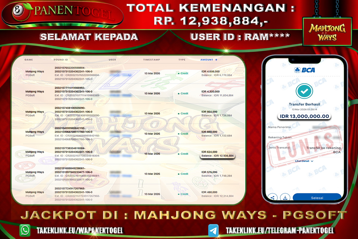 Selamat Kepada User ID : RAM**** Member PANENTOGEL JACKPOT MAHJONG WAYS