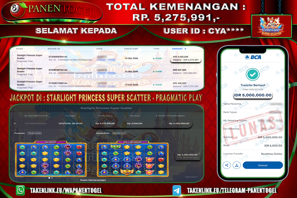 Selamat Kepada User ID : CYA**** Member PANENTOGEL JACKPOT STARLIGHT PRINCESS 1000