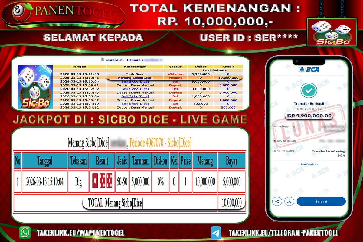BUKTI KEMENANGAN CASINO SICBO DICE PANENTOGEL Rp. 10.000.000, - LUNAS