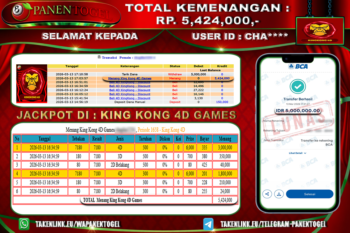 Selamat Kepada User ID : CHA**** Member PANENTOGEL JACKPOT TOGEL KING KONG 4D GAMES