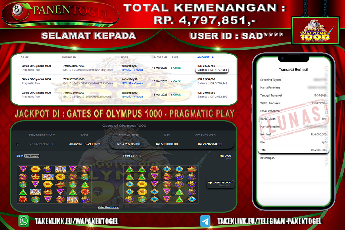 Selamat Kepada User ID : SAD**** Member PANENTOGEL JACKPOT GATES OF OLYMPUS 1000
