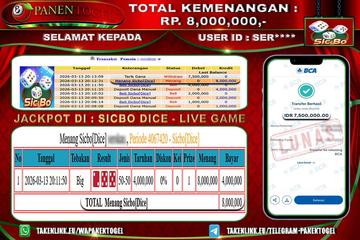 BUKTI KEMENANGAN CASINO SICBO DICE PANENTOGEL Rp. 8.000.000, - LUNAS