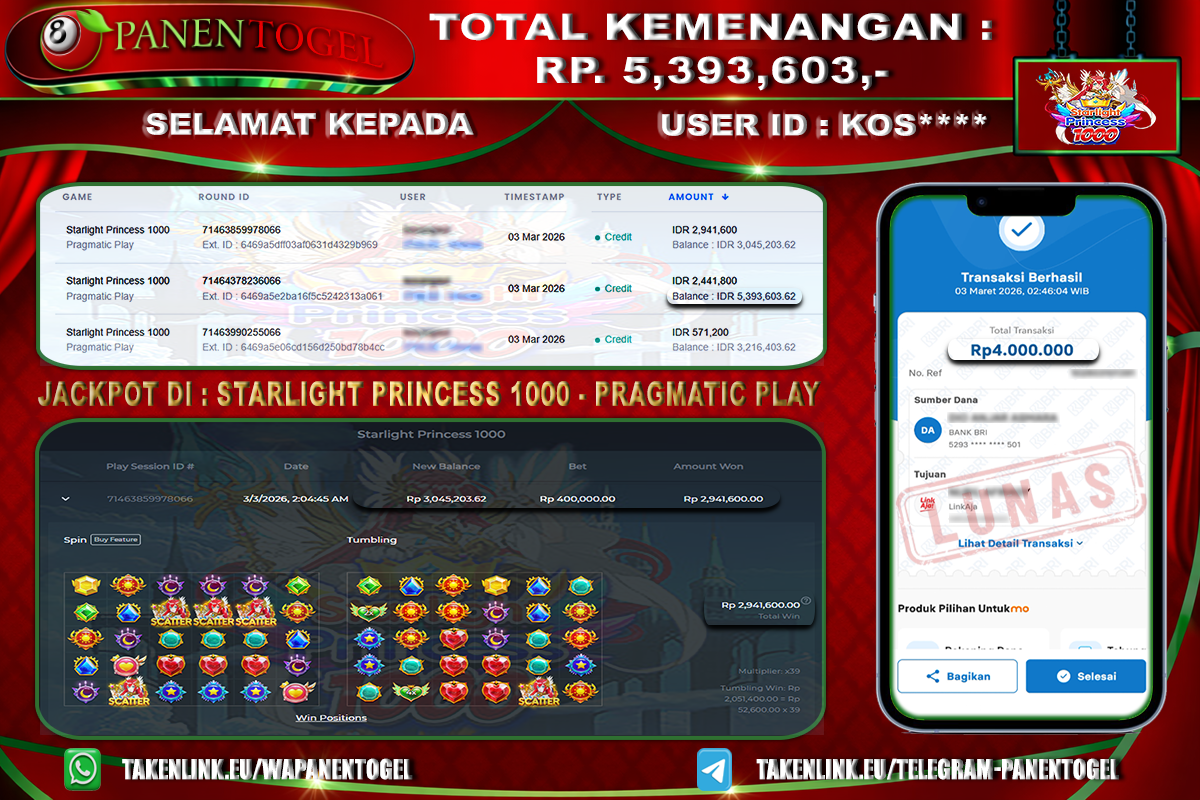 Selamat Kepada User ID : KOS**** Member PANENTOGEL JACKPOT STARLIGHT PRINCESS 1000