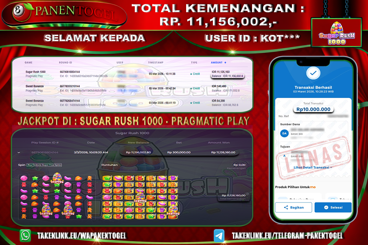 Selamat Kepada User ID : KOT**** Member PANENTOGEL JACKPOT SUGAR RUSH 1000