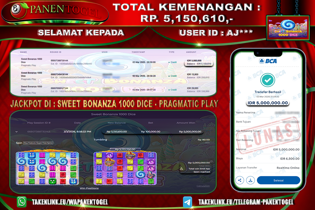 Selamat Kepada User ID : AJ**** Member PANENTOGEL JACKPOT SWEET BONANZA 1000 DICE