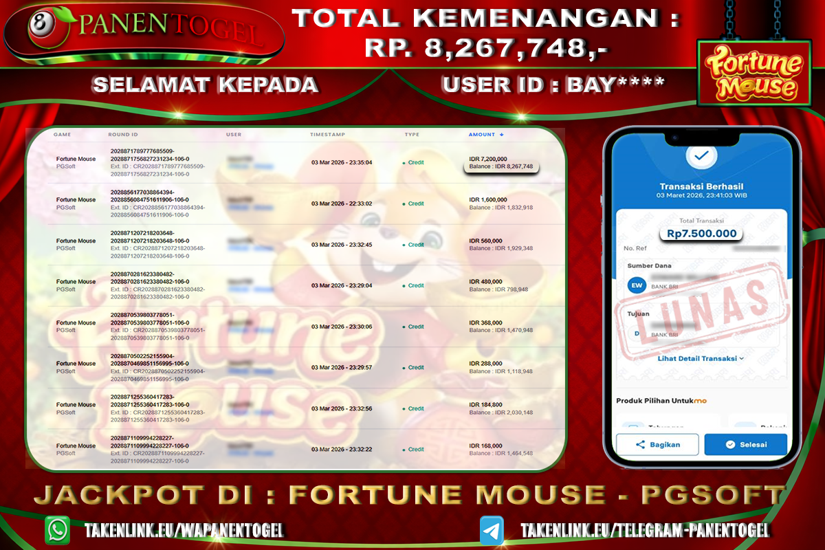 Selamat Kepada User ID : BAY**** Member PANENTOGEL JACKPOT FORTUNE MOUSE