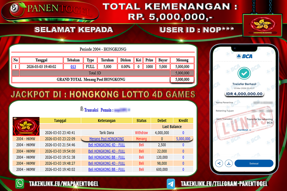 BUKTI KEMENANGAN TOGEL HONGKONG LOTTO 4D GAMES Rp. 5.000.000, - LUNAS