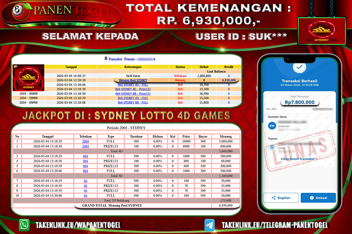 Selamat Kepada User ID : SUK**** Member PANENTOGEL JACKPOT TOGEL SYDNEY LOTTO 4D GAMES