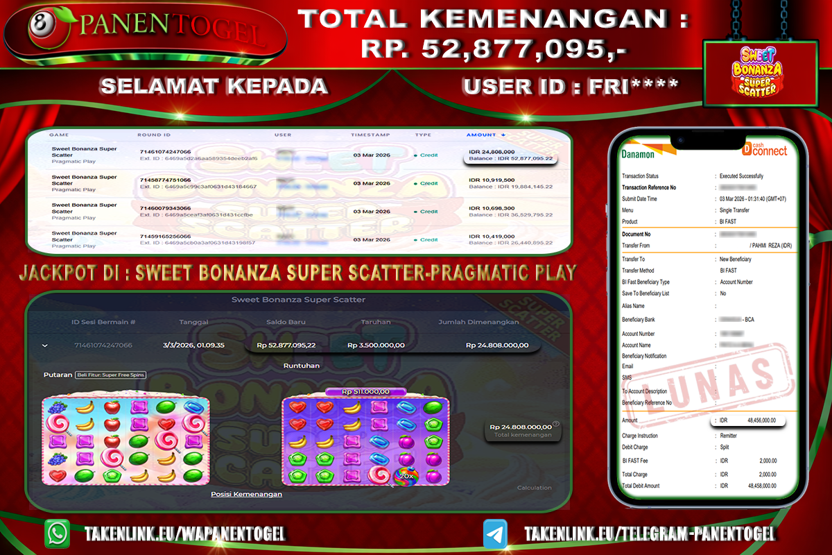 Selamat Kepada User ID : FRI**** Member PANENTOGEL JACKPOT SWEET BONANZA SUPER SCATTER