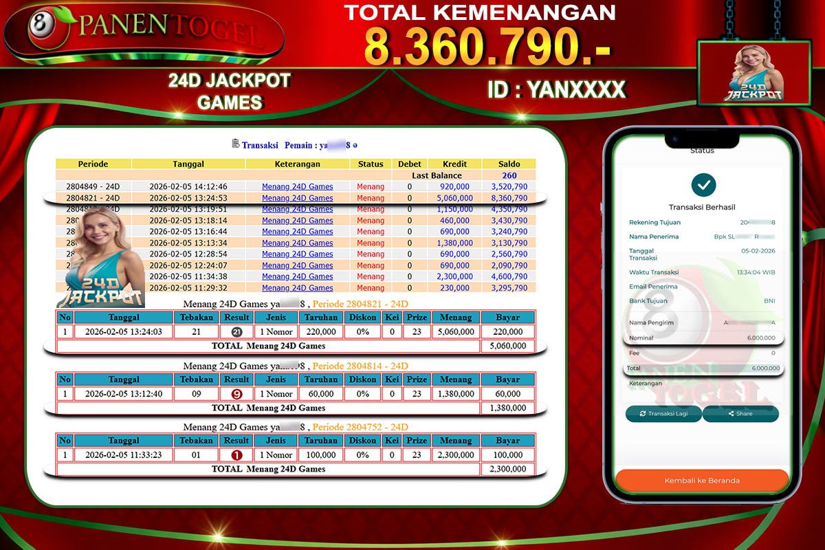 BUKTI KEMENANGAN LIVE GAME 24D JACKPOT PANENTOGEL Rp. 8.360.790, - LUNAS