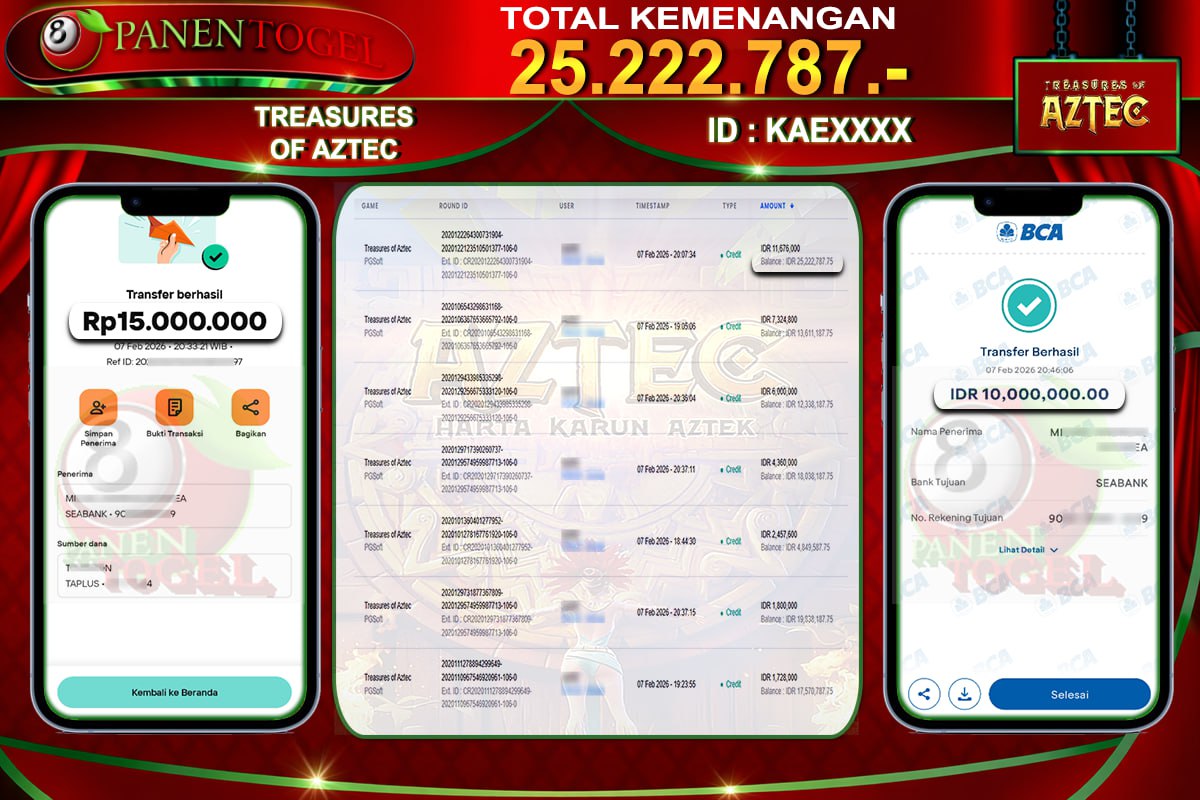 Selamat Kepada User ID : KAE**** Member PANENTOGEL JACKPOT TREASURES OF AZTEC