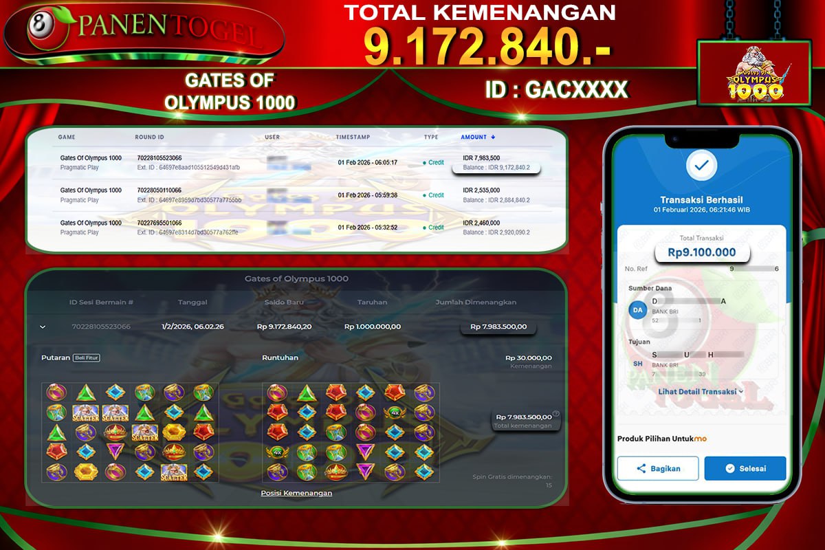 BUKTI KEMENANGAN SLOT PANENTOGEL Rp. 9.172.840, - LUNAS