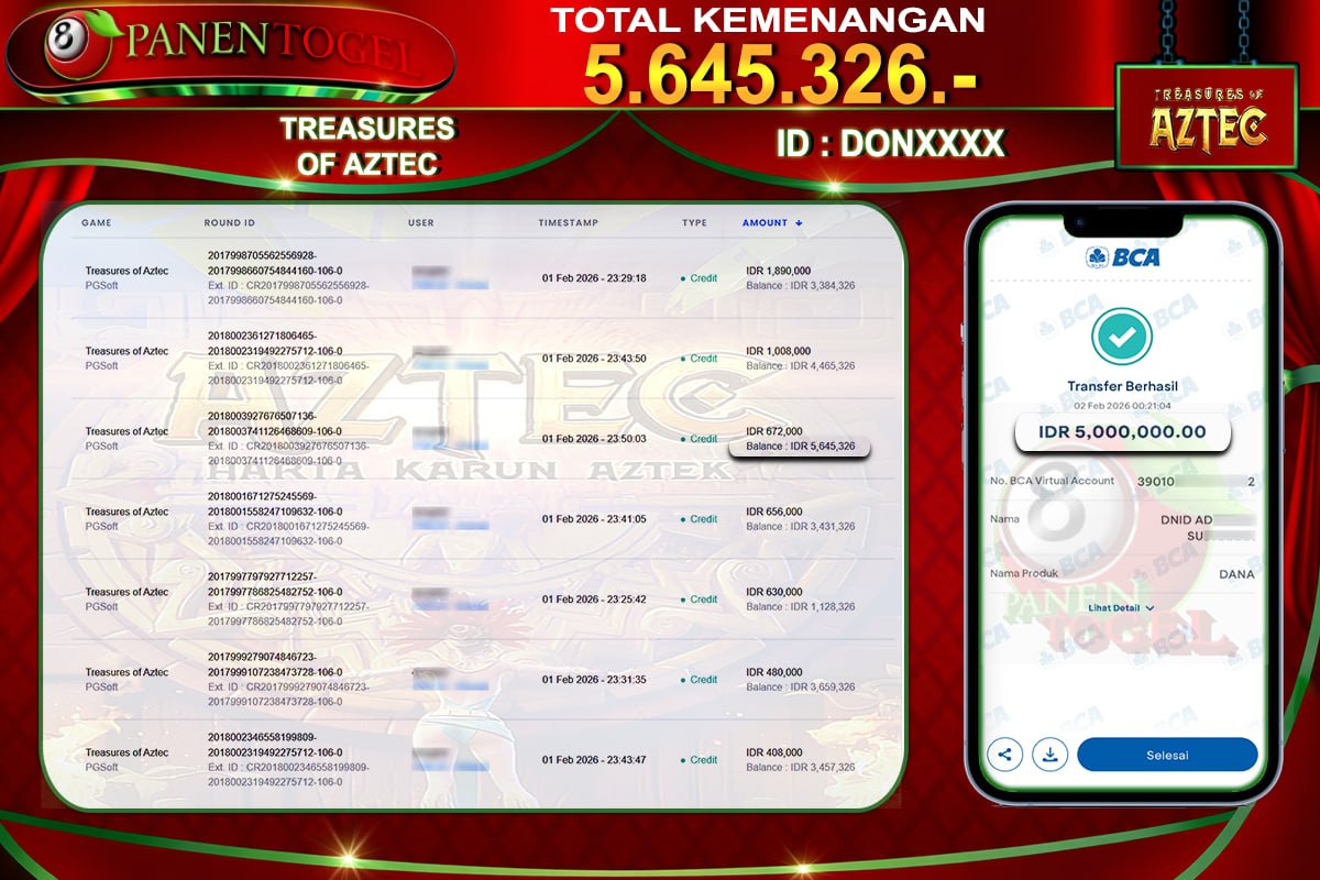 Selamat Kepada User ID : DON**** Member PANENTOGEL JACKPOT TREASURES OF AZTEC