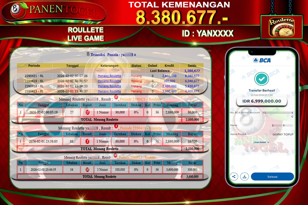 BUKTI KEMENANGAN ROULLETE PANENTOGEL Rp. 8.380.677, - LUNAS