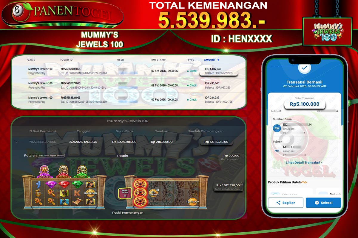 Selamat Kepada User ID : HEN**** Member PANENTOGEL JACKPOT MUMMY'S JEWELS 100