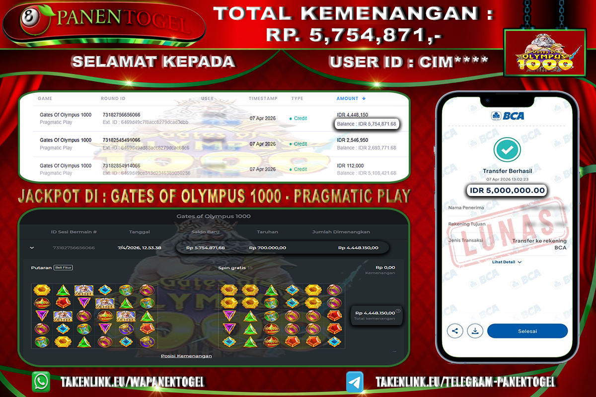 Selamat Kepada User ID : CIM**** Member PANENTOGEL JACKPOT GATES OF OLYMPUS 1000