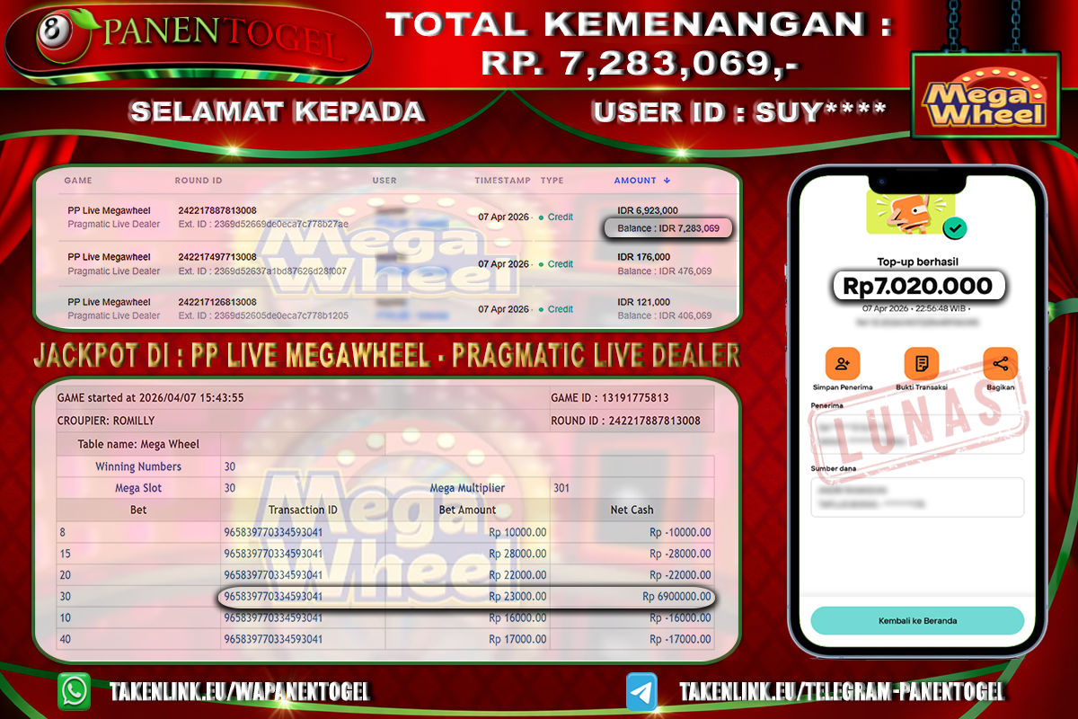 Selamat Kepada User ID : SUY**** Member PANENTOGEL JACKPOT LIVE MEGAWHEEL PRAGMATIC LIVE DEALER