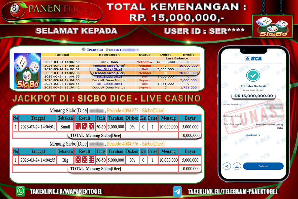 BUKTI KEMENANGAN CASINO SICBO DICE PANENTOGEL Rp. 15.000.000, - LUNAS