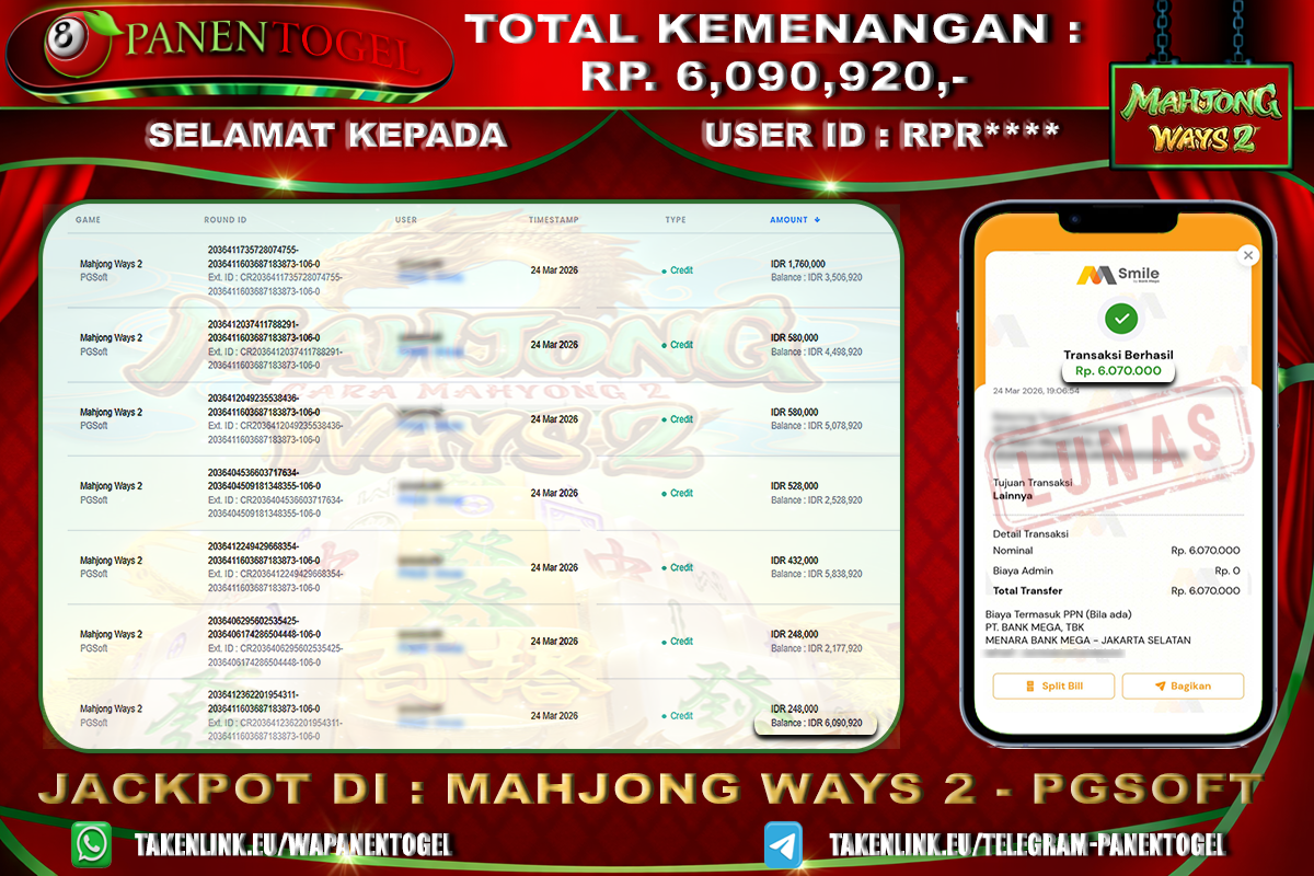 Selamat Kepada User ID : RPR**** Member PANENTOGEL JACKPOT MAHJONG WAYS 2