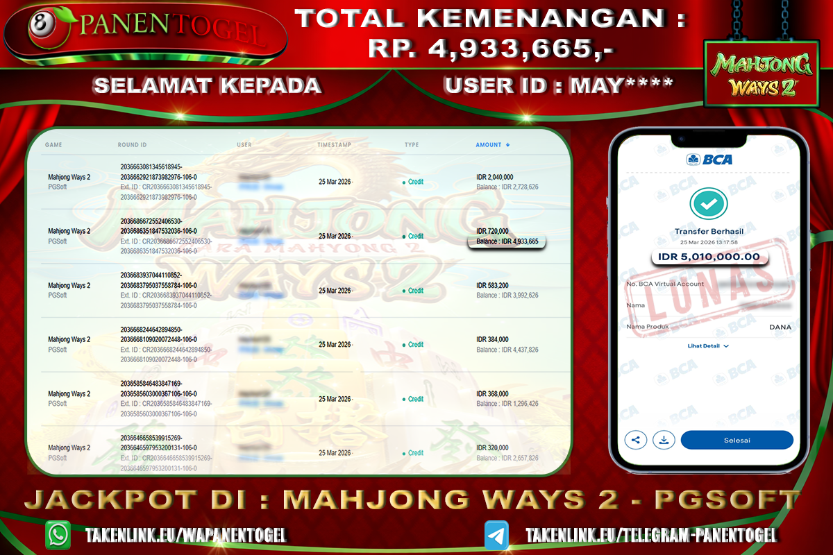 Selamat Kepada User ID : MAY**** Member PANENTOGEL JACKPOT MAHJONG WAYS 2
