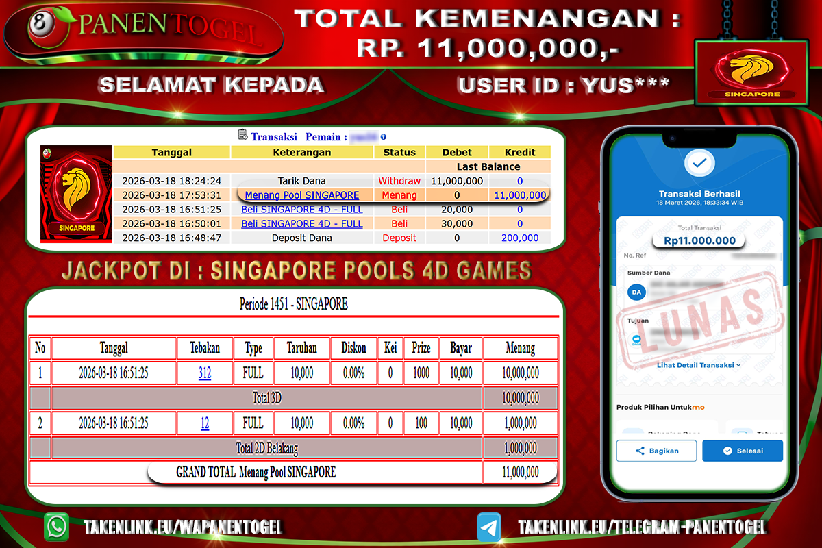 BUKTI KEMENANGAN TOGEL SINGAPORE POOLS 4D GAMES PANENTOGEL Rp. 11.000.000, - LUNAS