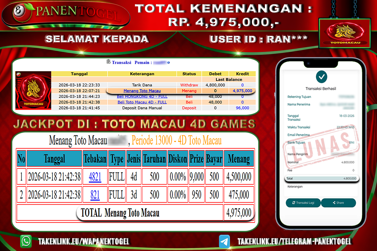 Selamat Kepada User ID : RAN**** Member PANENTOGEL JACKPOT TOGEL TOTO MACAU 4D GAMES