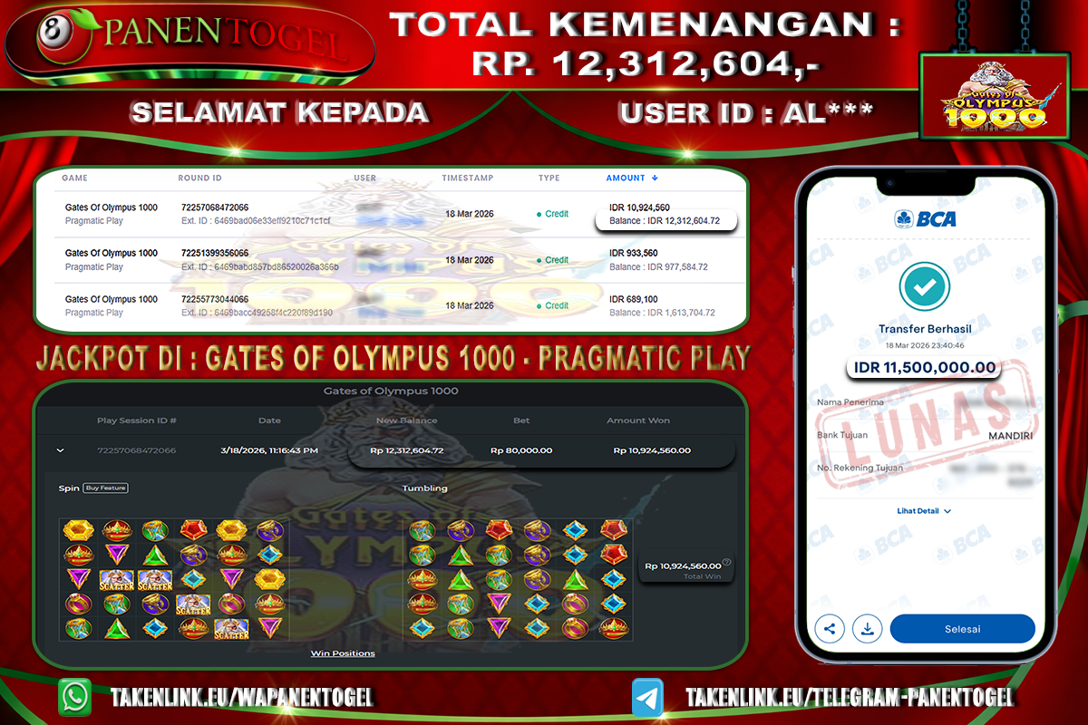 Selamat Kepada User ID : AL**** Member PANENTOGEL JACKPOT GATES OF OLYMPUS 1000