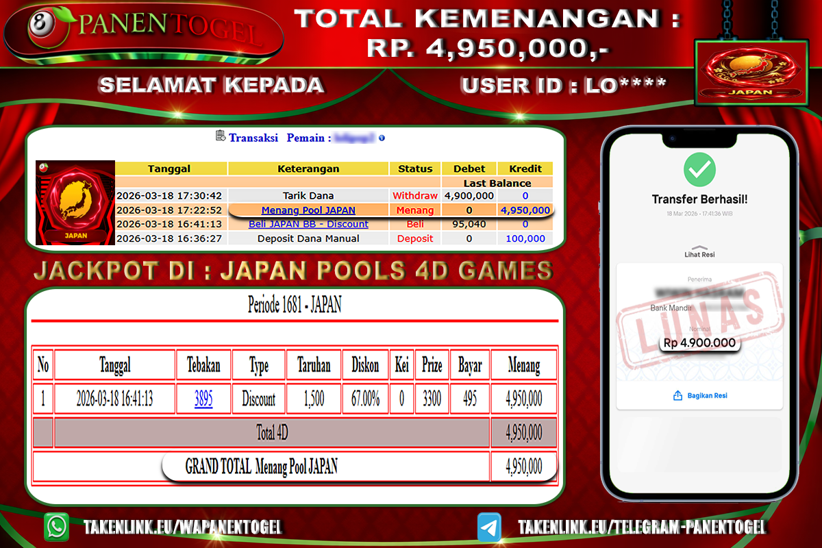 BUKTI KEMENANGAN JAPAN POOLS 4D GAMES PANENTOGEL Rp. 4.950.000, - LUNAS