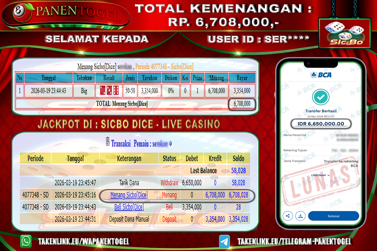 BUKTI KEMENANGAN CASINO SICBO DICE PANENTOGEL Rp. 6.708.000, - LUNAS