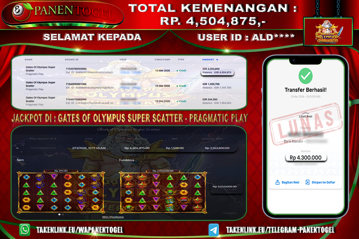 Selamat Kepada User ID : ALD**** Member PANENTOGEL JACKPOT GATES OF OLYMPUS SUPER SCATTER