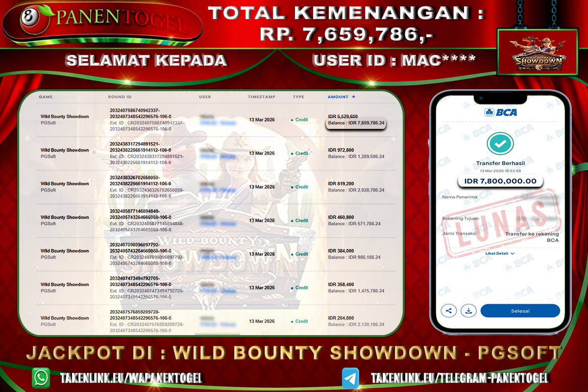 Selamat Kepada User ID : MAC**** Member PANENTOGEL JACKPOT WILD BOUNTY SHOWDOWN