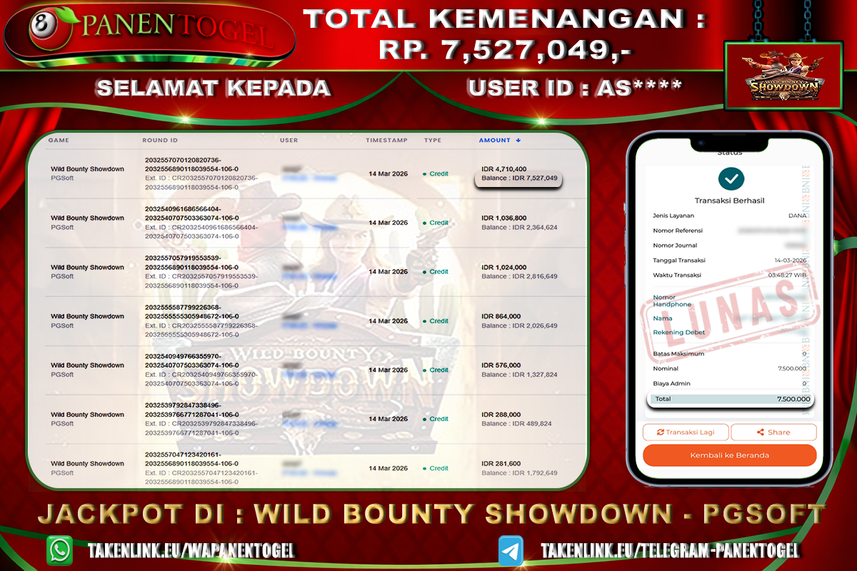 Selamat Kepada User ID : AS**** Member PANENTOGEL JACKPOT WILD BOUNTY SHOWDOWN