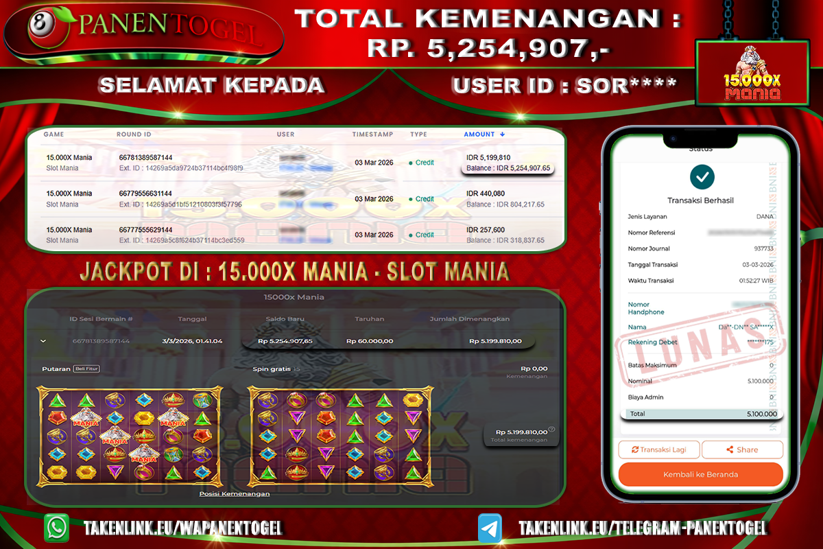 Selamat Kepada User ID : SOR**** Member PANENTOGEL JACKPOT 15.000X MANIA