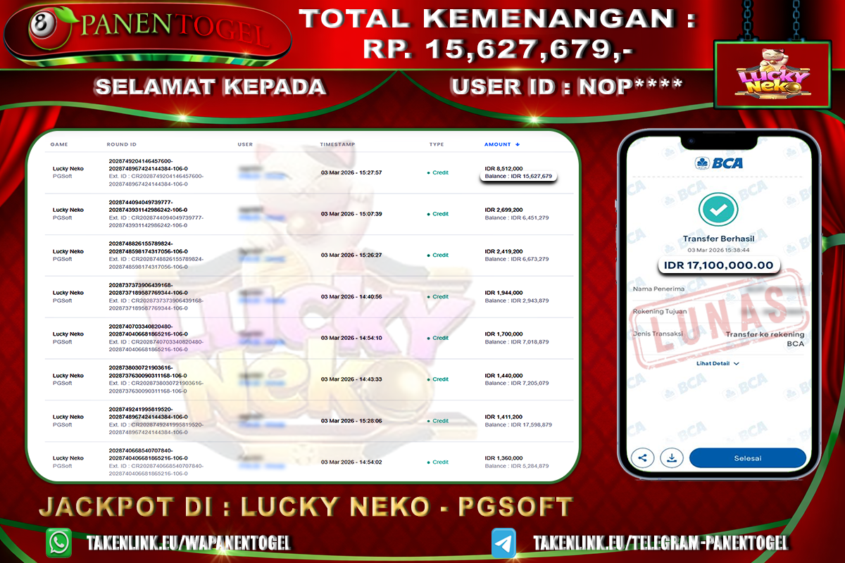 Selamat Kepada User ID : NOP**** Member PANENTOGEL JACKPOT LUCKY NEKO