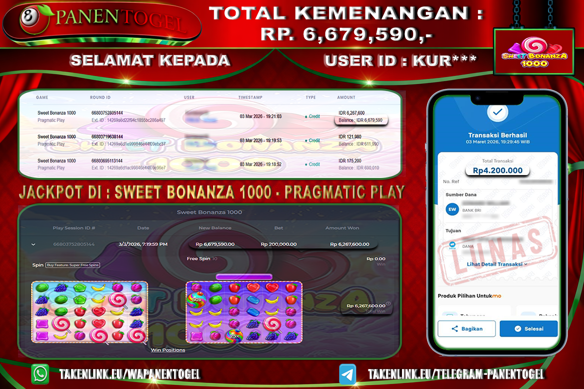 Selamat Kepada User ID : KUR**** Member PANENTOGEL JACKPOT SWEET BONANZA 1000