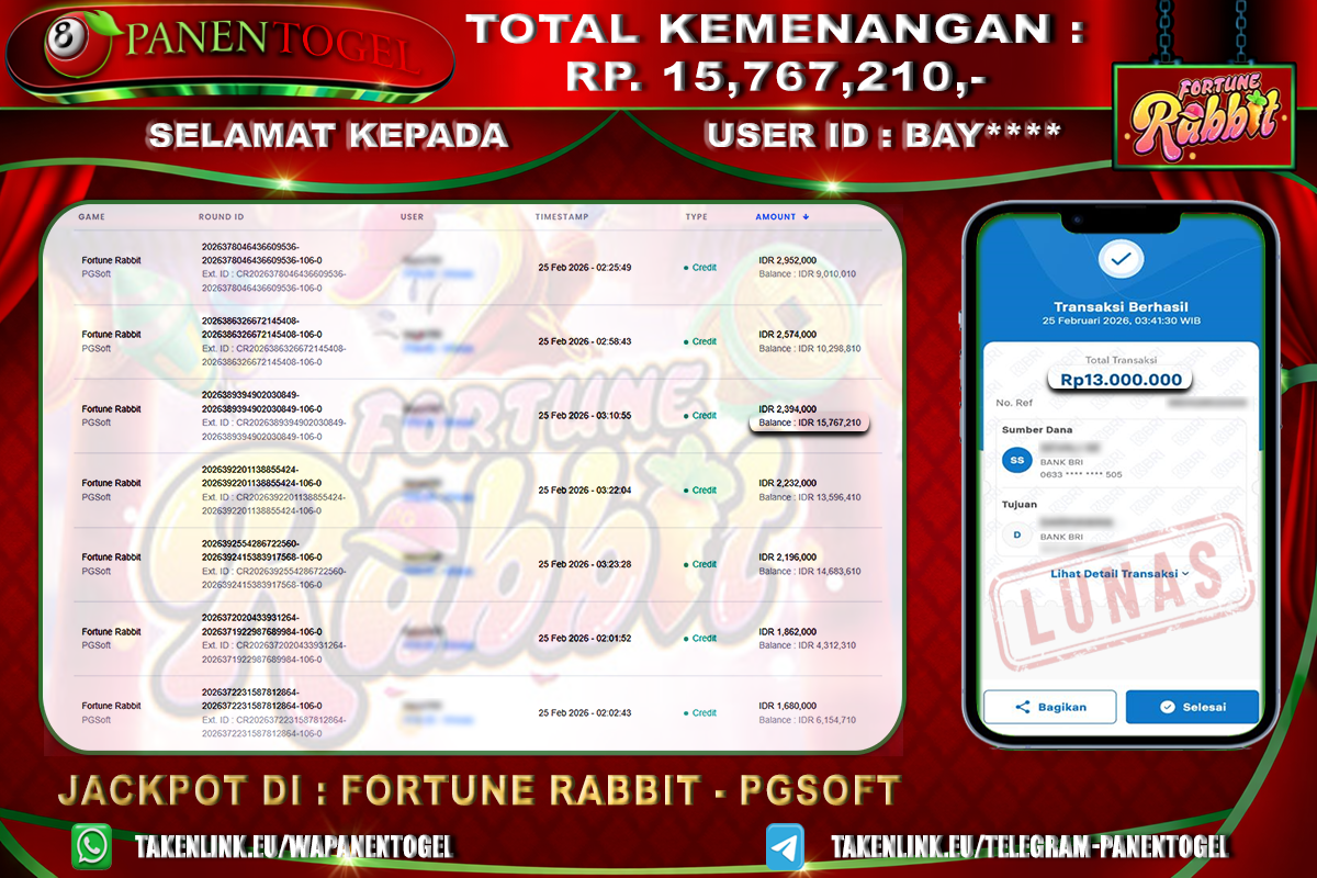 Selamat Kepada User ID : BAY**** Member PANENTOGEL JACKPOT FORTUNE RABBIT