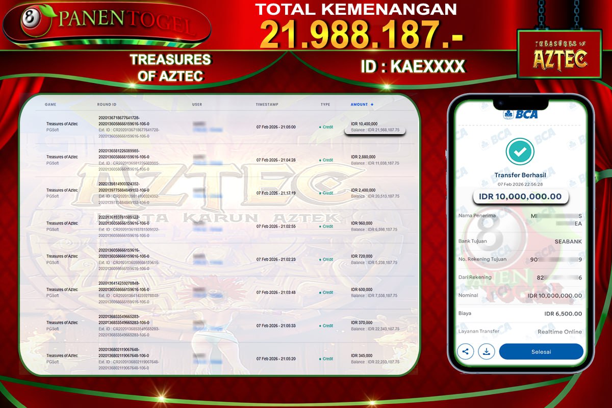 Selamat Kepada User ID : KAE**** Member PANENTOGEL JACKPOT TREASURES OF AZTEC