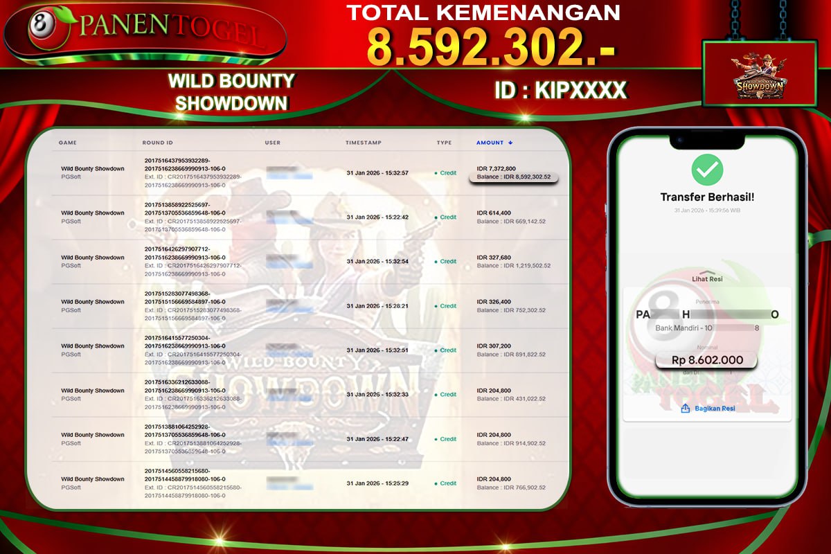 Selamat Kepada User ID : KIP**** Member PANENTOGEL JACKPOT WILD BOUNTY SHOWDOWN