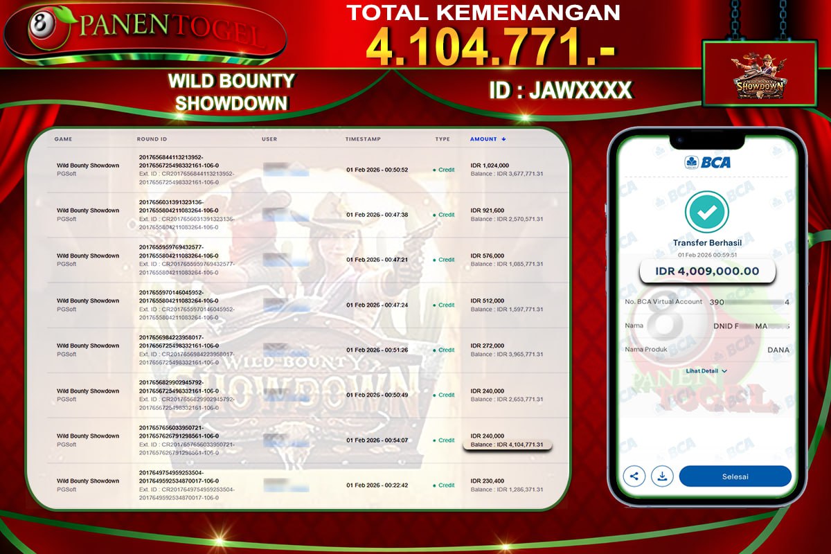 Selamat Kepada User ID : JAW**** Member PANENTOGEL JACKPOT WILD BOUNTY SHOWDOWN
